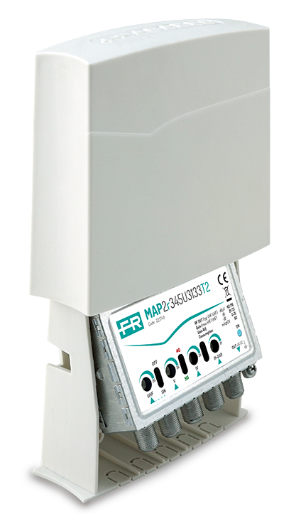 Amplificatore con 4 ingressi (III+DAB, IV, V, UHF) da palo con guadagno 25dB e livello di uscita fino a 116dBμV in banda UHF, amplificazioni separate VHF/UHF, regolazioni del guadagno (0-15dB) indipendenti per ogni ingresso e bassa figura di rumore. Tecnologia T2 con filtro integrato per eliminare le interferenze 5G a 694MHz.