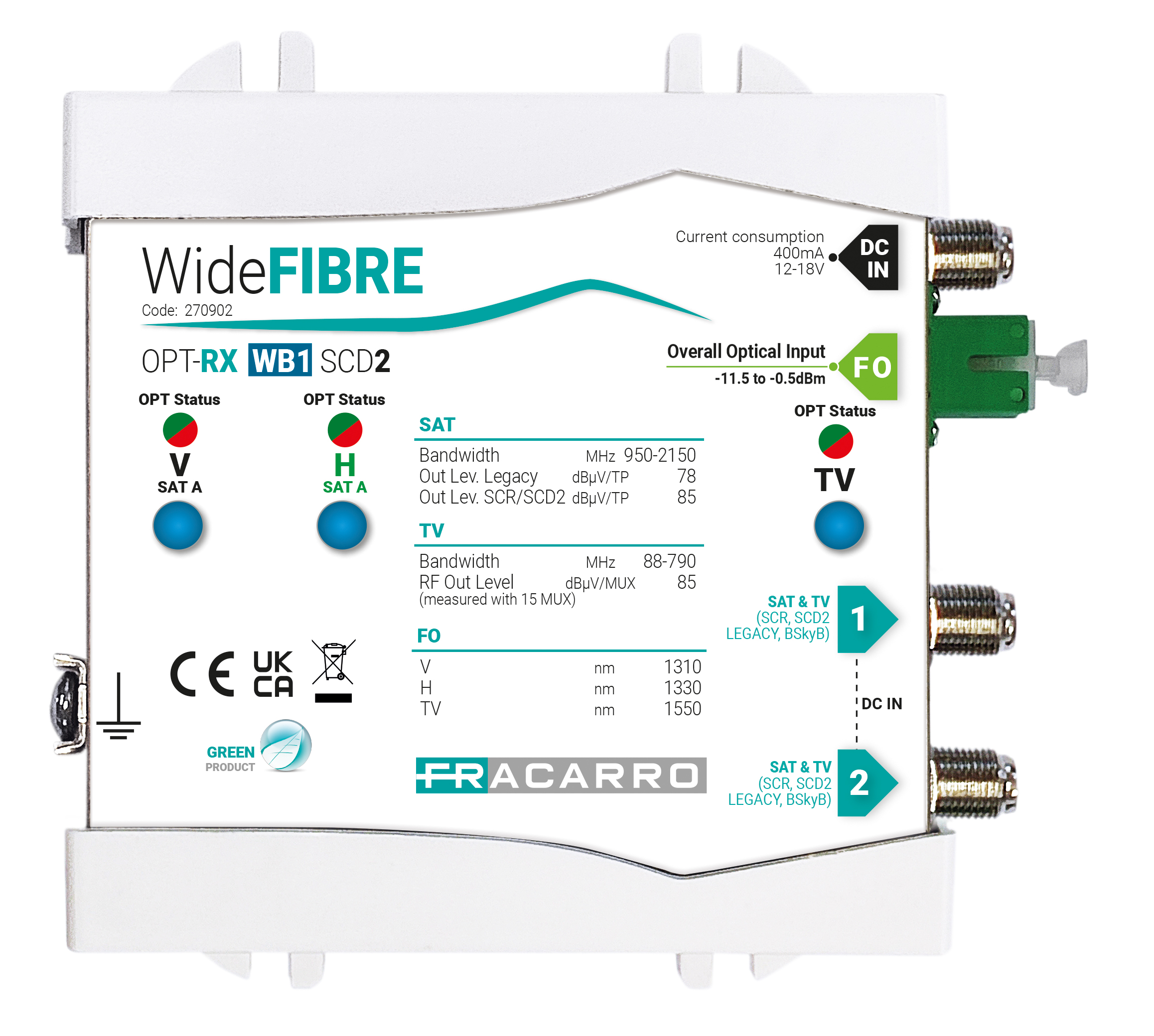 Ricevitore Wide Fibre che converte il segnale ottico proveniente dal trasmettitore OPT-TX WB1 in segnale coassiale; dispone di 2 uscite SCD2 multistandard (SCR/dCSS/dSCR-BSkyB e legacy) con il segnale TV miscelato.