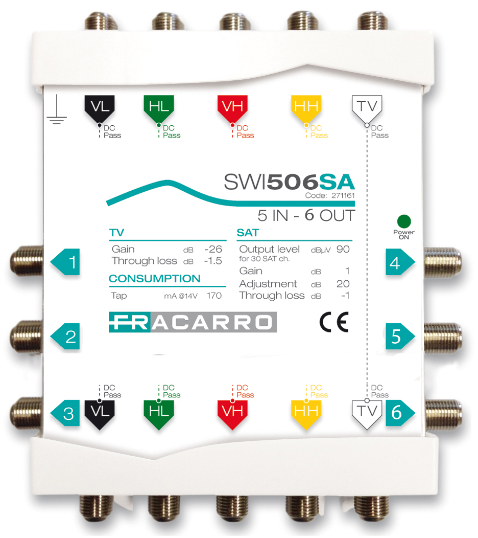 Multiswitch in cascata a 5 ingressi e 6 uscite derivate con TV passivo e guadagno Satellite attivo regolabile.