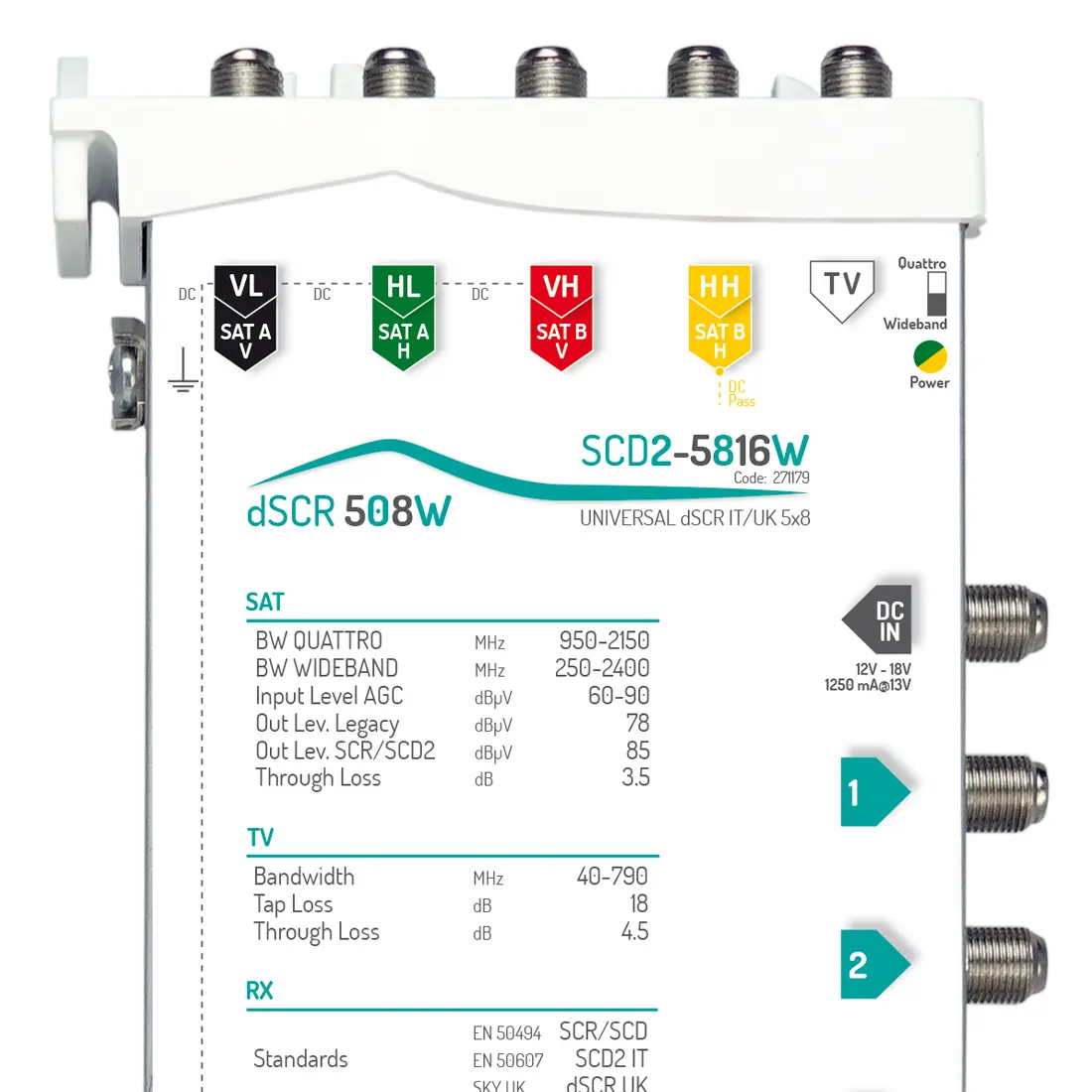 Multiswitch SCD2 (dCSS) in cascata, 5 ingressi con CAG compatibili anche con LNB Wideband e 8 uscite derivate con 16 frequenze ciascuna e autodetection della modalità di funzionamento, alimentato interamente da connettore DC-IN, da linea VL o da decoder. Frequenze SKY Italia e SKY UK.