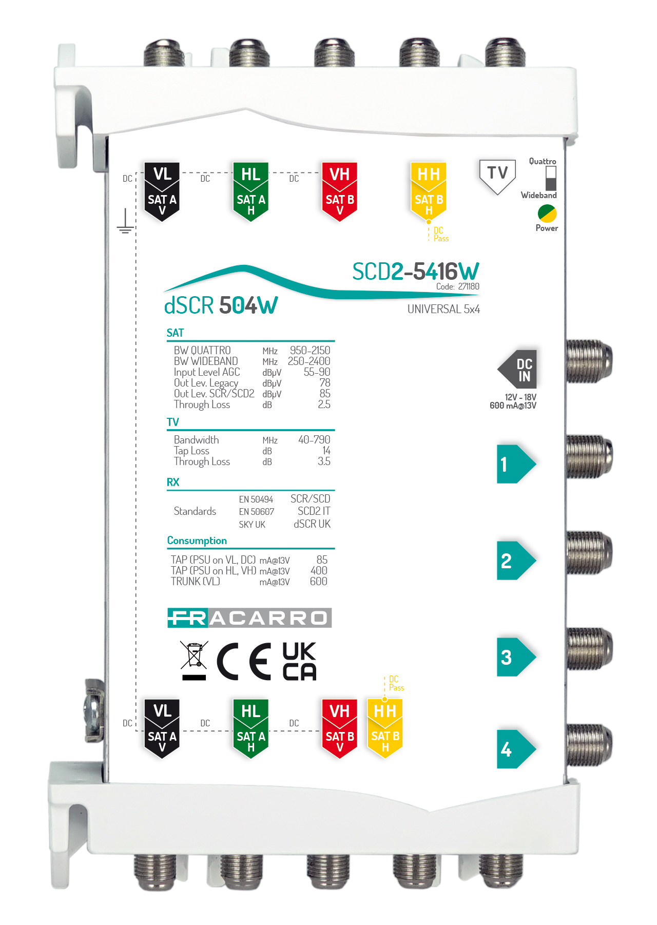 Multiswitch SCD2 (dCSS) in cascata, 5 ingressi con CAG compatibili anche con LNB Wideband e 4 uscite derivate con 16 frequenze ciascuna e autodetection della modalità di funzionamento, alimentato interamente da connettore DC-IN, da linea VL o da decoder. Frequenze SKY Italia e SKY UK.