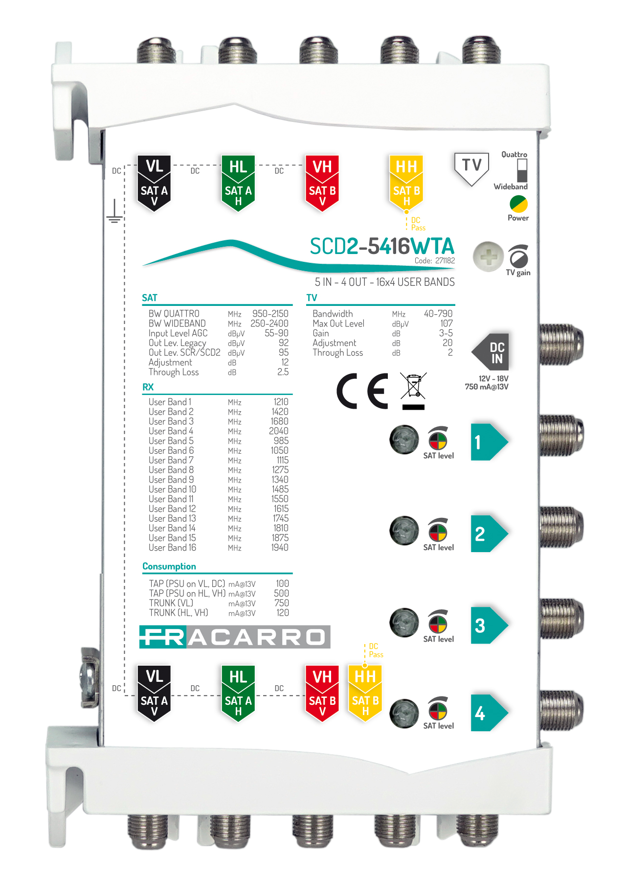 Multiswitch SCD2 (dCSS) in cascata, 5 ingressi attivi e regolabili con CAG compatibili anche con LNB Wideband e 4 uscite derivate con 16 frequenze ciascuna e autodetection della modalità di funzionamento, alimentato interamente da connettore DC-IN, da linea VL o da decoder. Frequenze SKY Italia.