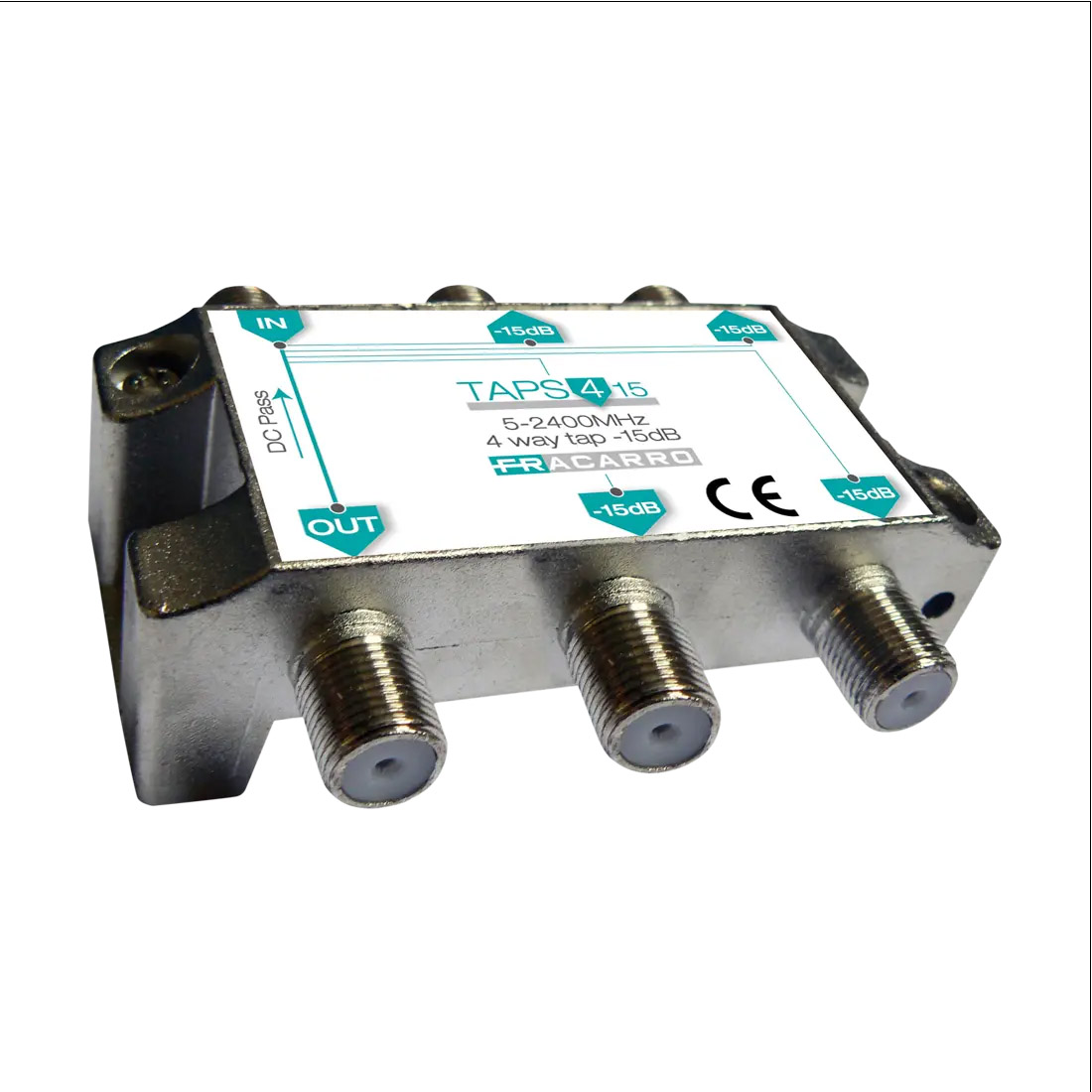 Derivatore orizzontale “top-down” a 4 vie con attenuazione 15dB e connettore F in banda TV e Satellite (5-2400MHz).