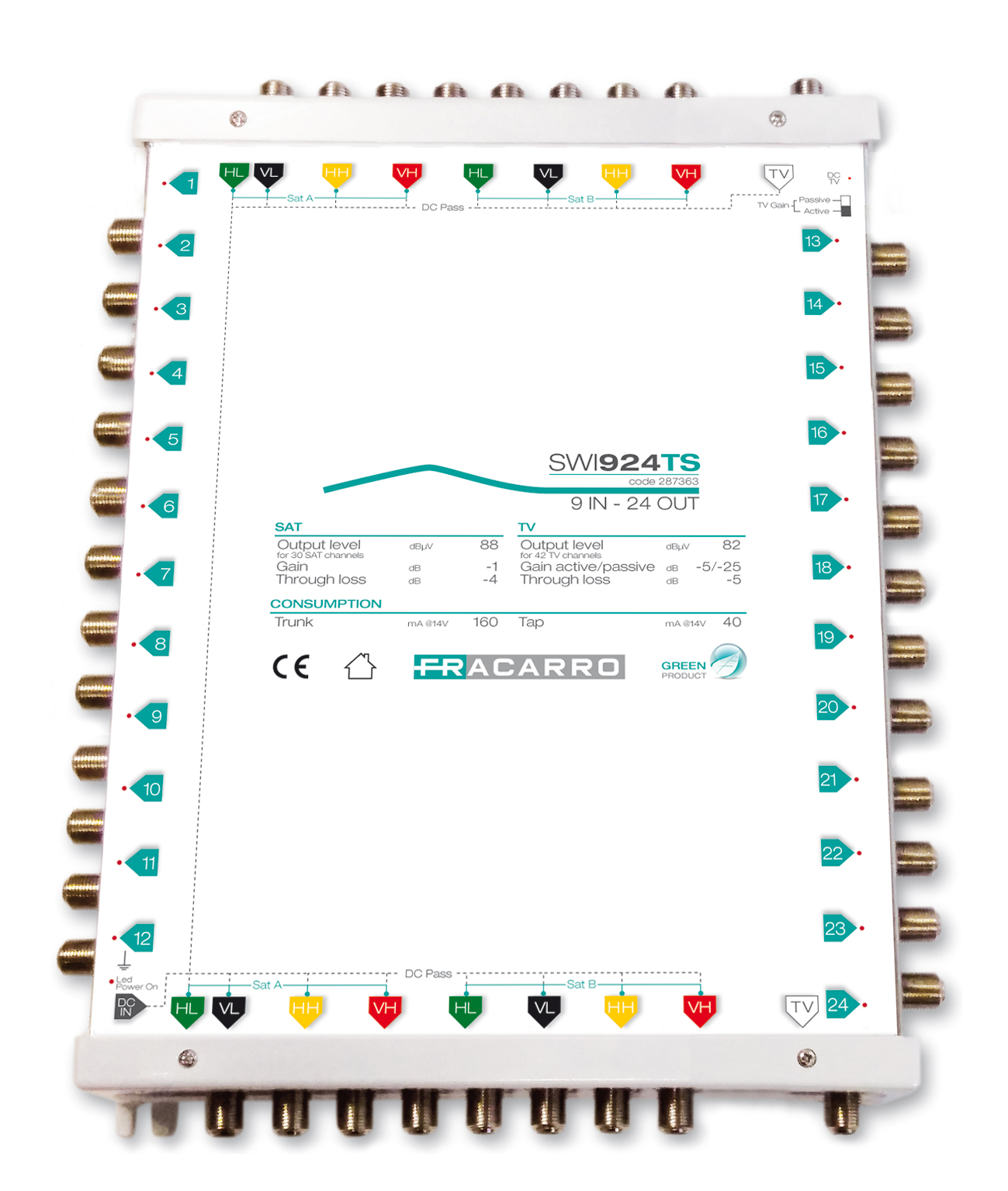 - Ogni porta ha un LED che mostra la corretta ricezione dei comandi DiSEqC.