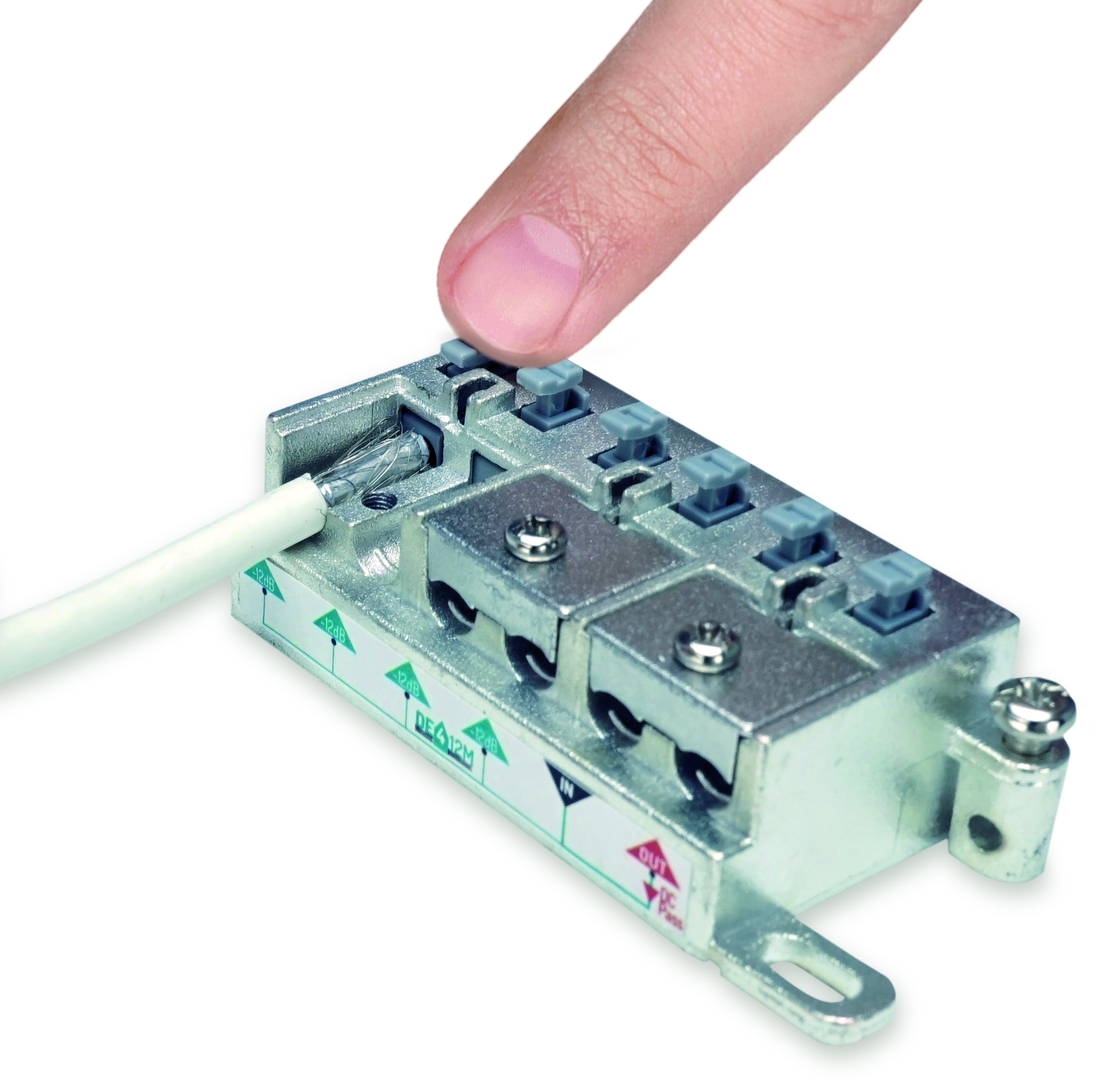 Derivatore a morsetto a 4 vie con attenuazione 12dB della serie DEM in banda TV e Satellite (5-2400MHz).
