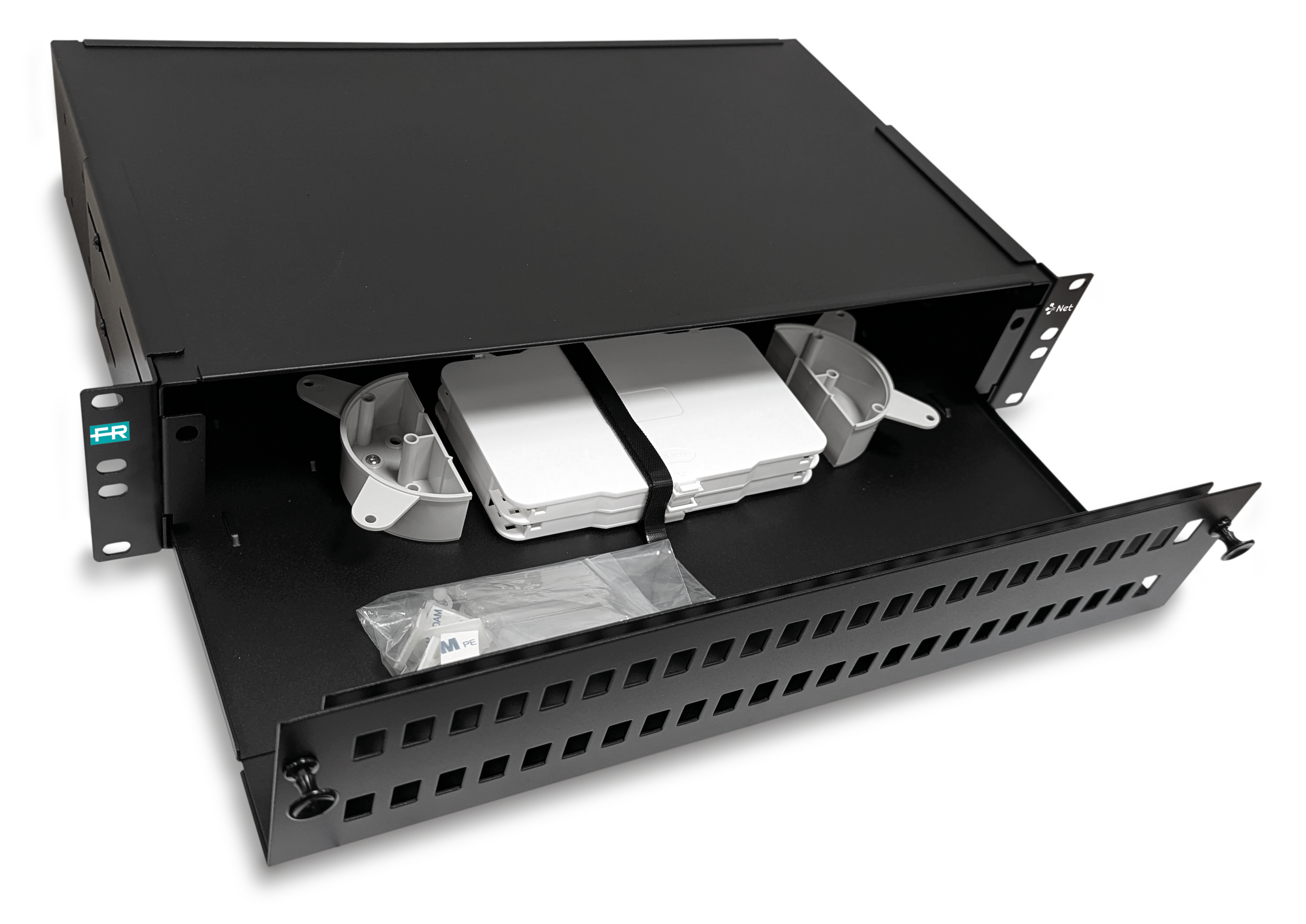 Cassetto ottico in acciaio verniciato, fissaggio a rack 19" con predisposizione per 48 connessioni ottiche SC/APC simplex.